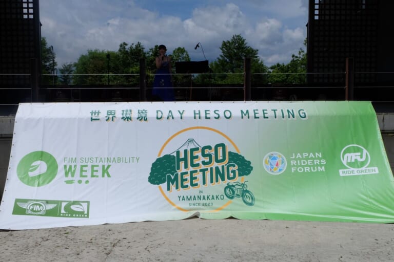 SSTRが終了してわずか1週間しか経っていない6月4日に、山中湖の「山中湖交流プラザきらら」で開催された「へそミーティング」。世界環境デーのこの日にどうしても開催したかったため、準備も不十分なままだったがあえて開催して、ライダーは常日頃から自然と共生していることを訴えたかったのだそうだ。