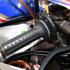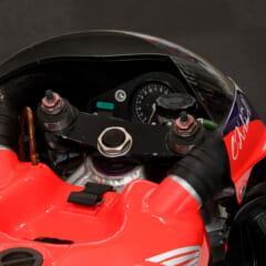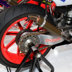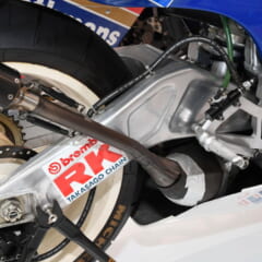 1992~1997年型NSR250は、片持ち式のプロアームを採用。この構成はリアタイヤ交換の容易さではなく、チャンバーの配置とバンク角を考慮した結果である。