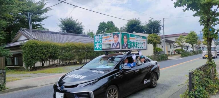 軽トラックやワゴン車がほとんどの中、選挙カーに仕立て上げた水素自動車のトヨタ・MIRAIで日の出町を巡回した。