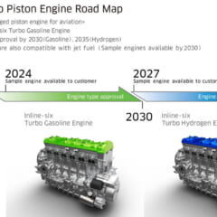 ニンジャH2Rのスーパーチャージド4気筒エンジンから、直列6気筒ターボガソリンエンジン(緑ヘッド)、直列6気筒ターボ液体水素エンジン(青ヘッド)へ。ガソリン版は2030年に認証登録、液体水素版は2035年に認証登録を目指す。ジェット燃料との互換性を持ったエンジンも同時開発し、こちらのサンプル供給は2030年。