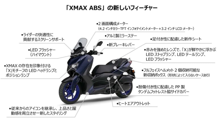 ヤマハは、2017年の初代誕生以来6年ぶりのモデルチェンジとなる新型「XMAX ABS」を発表。コンセプトは“Condensed 7days Mobility”とし、新スタイリングとディテールの向上、スマートフォン連携機能と2画面構成を採用した新型メーターなどで魅力を向上している。