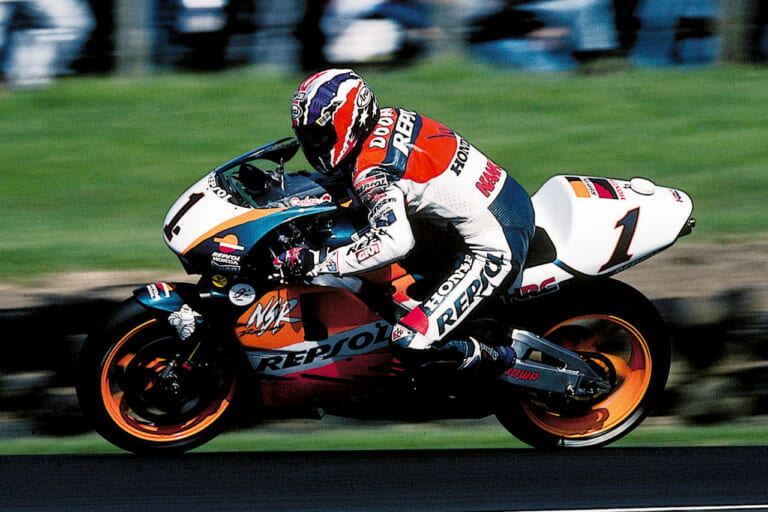 写真は1998年のミック・ドゥーハン。脊椎パッドなどは内蔵している時代だが、もちろんエアバッグも胸部プロテクターもない。