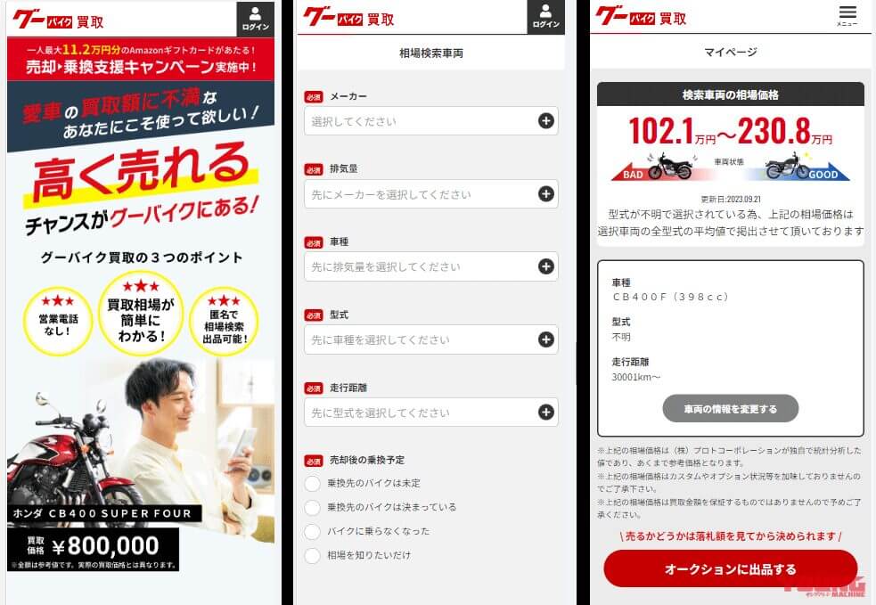 「グーバイク買取」は、ユーザーが出品した車両を「グーバイク」に掲載している全国約2500社のバイク販売店がオークション形式で入札し、最高値を入札したバイク販売店の落札額をユーザーが確認、売却するオークション形式のサービスだ。
