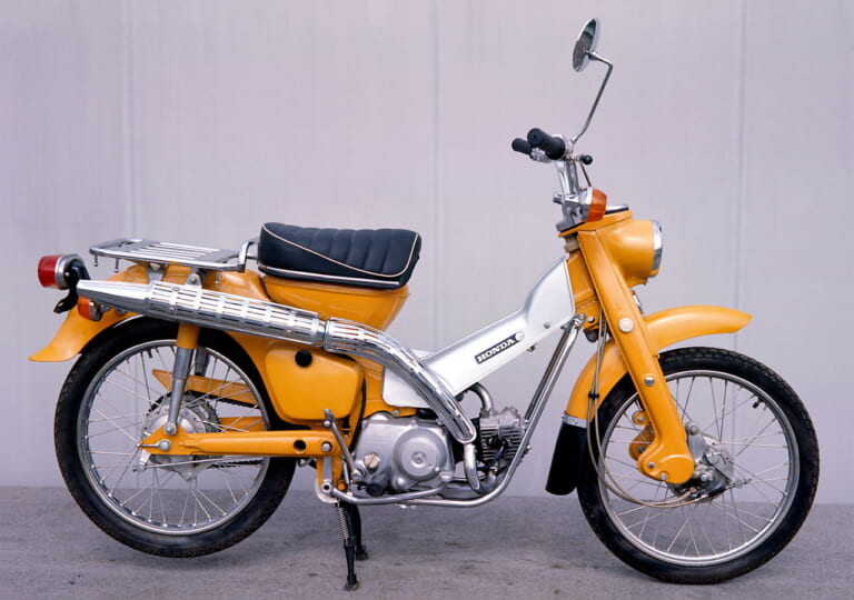 こちらは、販売不振に終わったC100Hから久々に復活した国内仕様で、CT50(1968年~)と名付けられた。CTの系譜で唯一の50ccであり、CT90譲りの副変速機を採用していた。が、時代が追い付いておらず約1年で生産終了。【HONDA CT50】■全長1805 全幅720 全高965 軸距1190 最低地上高155(各mm) 車重71.5kg(乾)■空冷4スト単気筒SOHC2バルブ 49cc 4.8ps/1000rpm 0.37kg-m/8200rpm 燃料タンク容量6L ■タイヤF=2.25-17 R=2.75-17 ※写真、諸元は’68年型