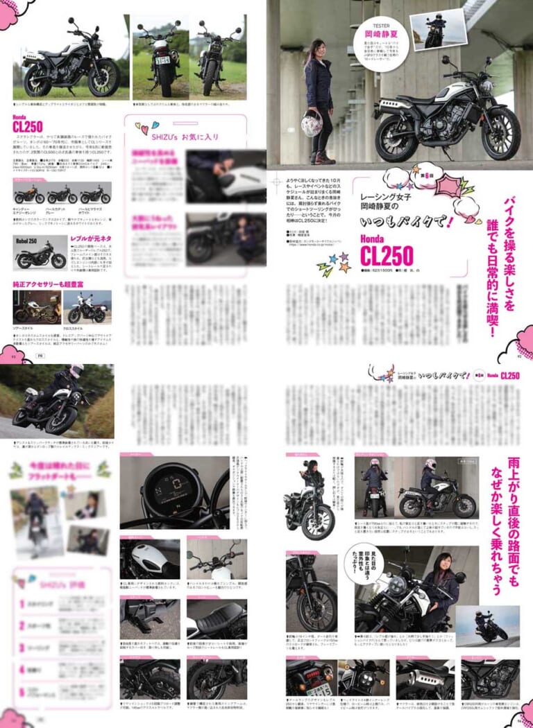 全日本ロードレース選手権に10年以上も参戦を続け、公道も走る筋金入りのバイクフリーク・岡崎静夏さん。発売されて間もなくCL250で街乗りと軽いオフロードを試してご機嫌です。