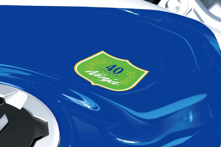 特徴的な白×青×緑の3カラーの色づくりやグラフィックの復刻、40周年記念ステッカーにチャンピオンロゴ風のデザインを採用するあたりは4RR/10Rと同じ。これに最新Ninja ZXフェイスの6Rが鋭い印象を上乗せしている。