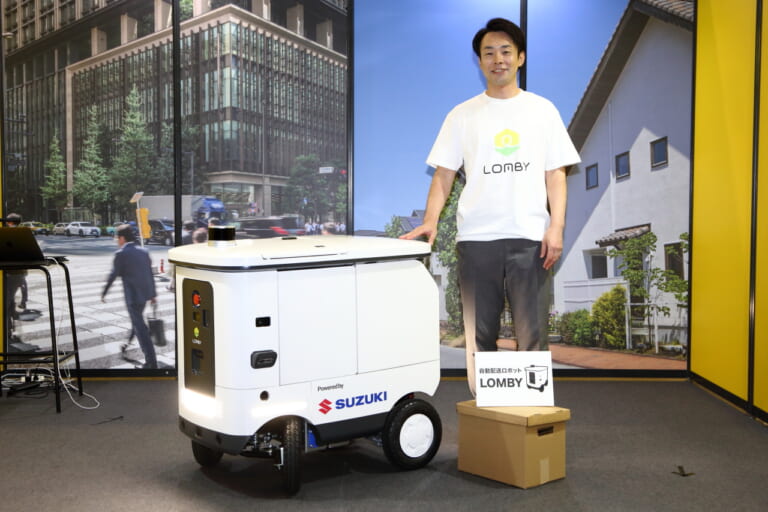 ジャパンモビリティショー2023の『Startup Future Factory』エリア内に出展していたLOMBY(ロンビー)というメーカーを訪ねて驚いた。商用実証試験中という自動配送ロボットの筐体には「Powered by SUZUKI」の文字があり、すでに南大沢地域で稼働しているというのだ。詳しく聞いてみた。