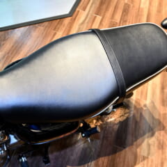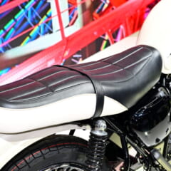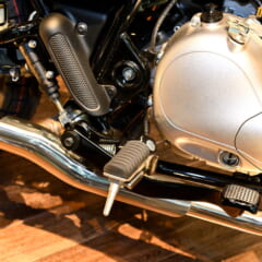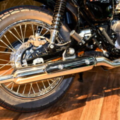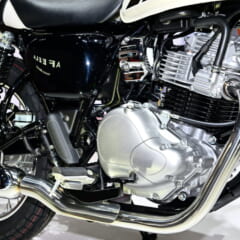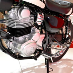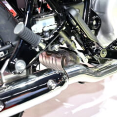 排気系はスイングアームのピボット下にチャンバー室を設けるが、トグロを巻くエキゾーストパイプを上手くカバーで隠す。ここもデザイナーがこだわった部分(写真はW230)。