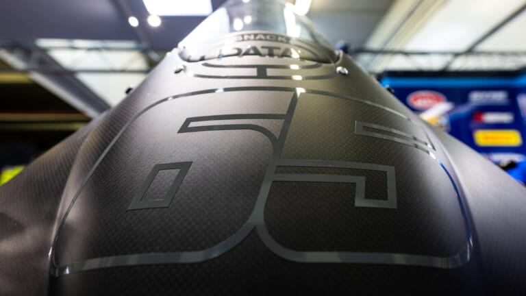 マシンはゼッケン65仕様になっているものの、まだテストのためスポンサーカラー等はなし。というかこれ、そのままこのカラーリングで市販車が出たら買う人も多いのではというクールさだ。艶消し黒に塗られ、シンプルな白のストライプが施されたほかは、オーリンズ製レーシングサスペンションやアクラポヴィッチ製マフラーなどが目立つのみ。また、レーシングスーツも同様に黒と白だが、レイ選手らしく足元などに赤の差し色が入っている。