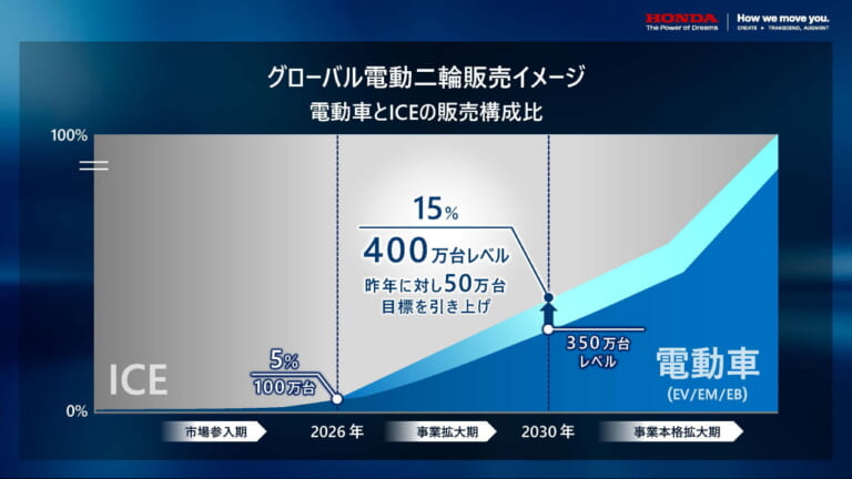 - 2030年のグローバルでの電動二輪車の年間販売台数目標を、昨年公表した350万台に対して50万台増となる400万台とする