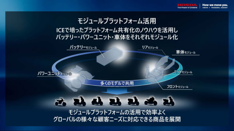 ホンダがこれまで作り上げてきたエンジン車でのノウハウを生かし、プラットフォームの共用化や走りの基本性能の高さを電動バイクにも注入するとともに、電動二輪車で大きく進化する装備のひとつであるコネクティビティを適用することで、快適性を高め、購入後も進化することが可能に。また、電動二輪車ではモジュールプラットフォームという形でバッテリー、パワーユニット、車体をそれぞれモジュール化し、これらを組み合わせることで、多様なバリエーション展開が可能になる。