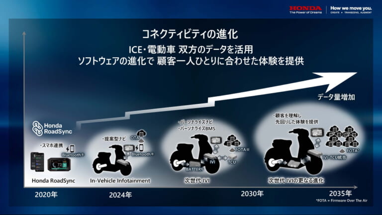 2026年上市モデルにはテレマティクス通信ユニット(TCU)を搭載し、さらなるサービスの進化を図る。将来的には、エンジン車と電動二輪車の双方から得られるデータを活用し、車両の利用状況から顧客のニーズを理解することで、新しい発見や安全性を高める機能など、ホンダならではの体験を提供していく。