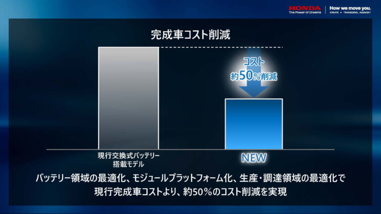 - コストダウンの取り組みを加速させ、現行の車体コストから50%削減