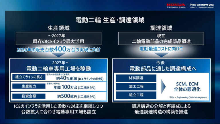 電動二輪車の生産は、まずは既存のICE用インフラを活用するが、2030年の販売台数400万台の実現に向けた盤石な体制構築と一層の競争力を確保すべく、2027年以降をめどに、電動二輪車専用生産工場をグローバルで順次稼働。この工場ではモジュール化技術などの採用により、組み立てラインの長さを従来に対し約40%削減し、高効率な生産体制を目指す。なお、専用工場は1工場当たり、投資金額は約500億円、生産能力は年間100万台規模を想定しているという。