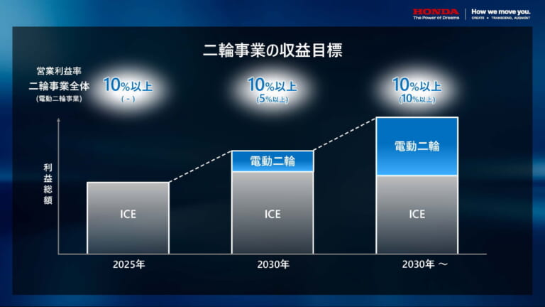 収益目標としては、2030年に電動二輪事業として営業利益率を5%以上、二輪事業全体としても10%以上の実現を目指すとした。そして2030年以降には、電動二輪事業として営業利益率10%以上を達成し、利益総額としてもさらなる増加を目指す。