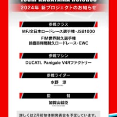 元GP・元SBKライダーでもある加賀山就臣さんが率いる「Team KAGAYAMA」が、2024年は新プロジェクトとしてこれまでのスズキからドゥカティに乗り換え、WSBK最強マシン・パニガーレV4Rファクトリーで『MFJ全日本ロードレース選手権・JSB1000』および『FIM世界耐久選手権 鈴鹿8時間耐久ロードレース・EWC』に参戦することを発表した。 ライダーは、2023年にホンダでJSB100 […]
