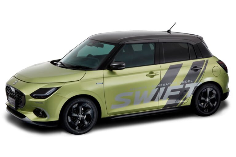 スイフト クールイエローレヴ(参考出品車):新型「スイフト」の新色であるクールイエローメタリックを、マットカラーに仕立てたコンセプトモデル。ボディサイドにグローバルモデルとして4代目となる「スイフト」をグラフィックで大胆に表現して、新世代コンパクトカー「スイフト」の登場がひと目でわかるモデルとした、としている。
