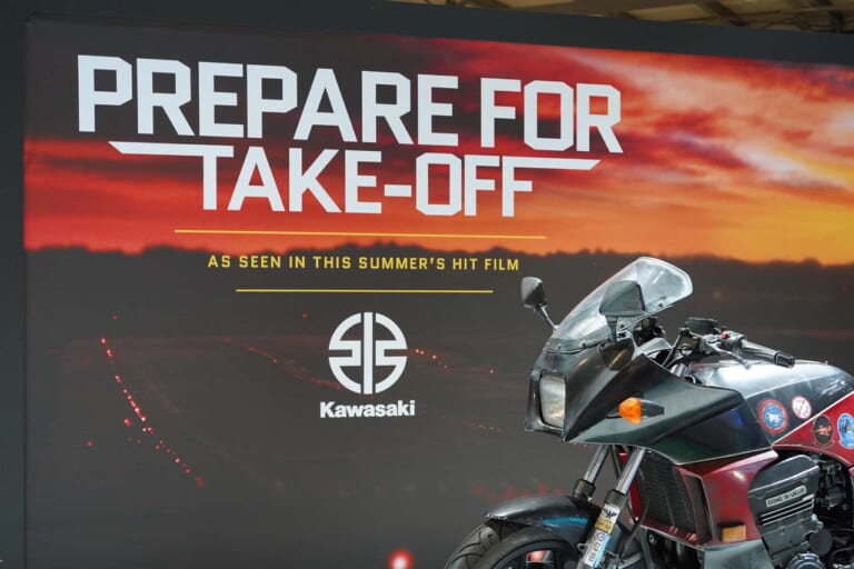 映画「トップガン」に劇中車として登場した’84年型GPZ900Rを展示し、背景には「PREPARE FOR TAKE-OFF≒離陸に備えよ」の文言が……。あまりにも意味深!