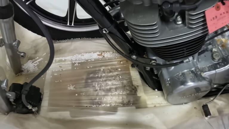 箱を開ける前から下のほうに空いている穴を気にしていた『Bikes and Beards』の面々だったが、木枠に続いて湿気対策の紙や発泡スチロールのトレーを丁寧に取り外していったところ、エンジンのシリンダー背面に蛇の巣? いやネズミの巣か……を見つけてしまった彼らであった。