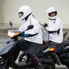 矢部高校でのバイク通学の様子。原付スクーター/フルフェイスヘルメット/指定のジャンパー/ナンバープレート部の表示などに規定がある。※写真は2016年撮影