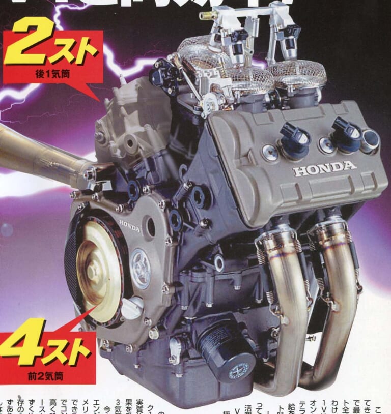 しかし、まだまだ2ストは終わっていなかった。本誌は、RCV大活躍の舞台裏でホンダが特殊なV3エンジンを完成させたとの極秘情報をキャッチ! なんとそれは、2ストと4ストを合体させたV3エンジンで、前2気筒が4スト、後1気筒が2ストという超変則的な設計になっているというのだ。この構成だと後1気筒はクランク1回転毎に1回爆発するので、実質的には4スト4気筒と同じ効果を発揮。高効率・省スペース型3気筒エンジンとなる。