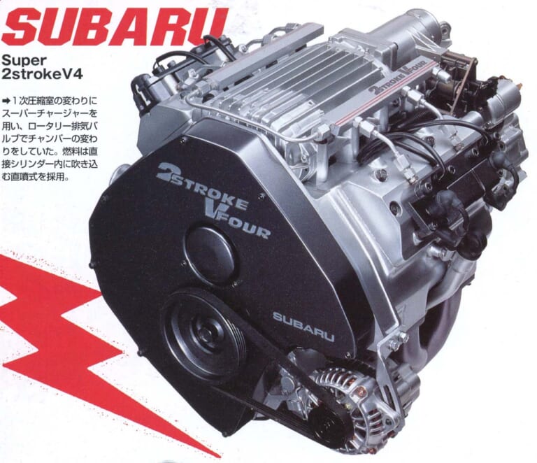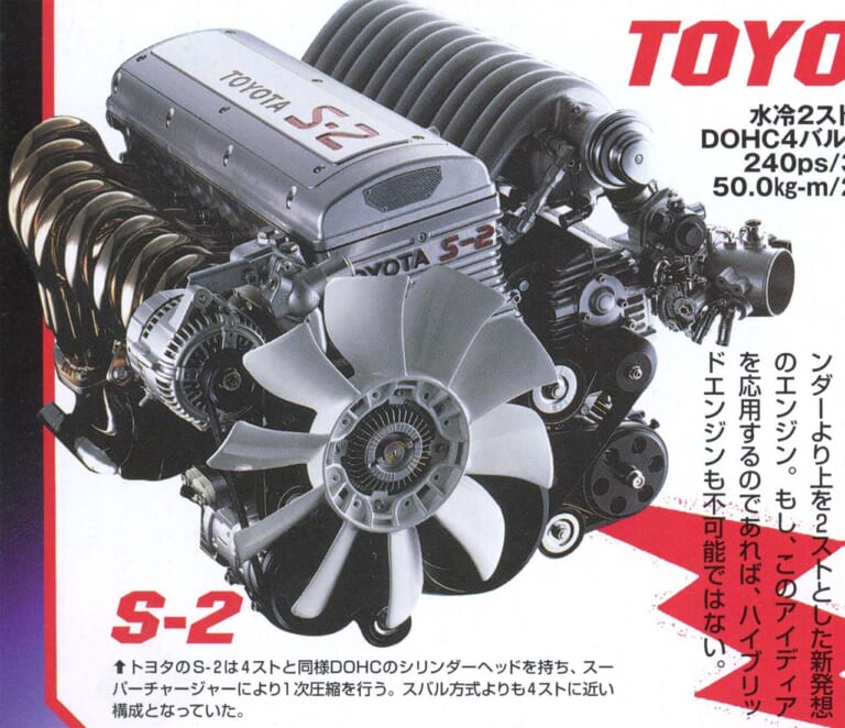 V3のヒントは’89東京モーターショーにあった。2ストといえば混合ガソリンによるオイルミストや燃費という環境的な問題を抱えているが、’89年の東京モーターショーでトヨタとスバルが、そのネガを解消させるプロトエンジンを出展していた。どうやらハイブリッドV3のヒントはここに隠されている気配だ。これらはクランクなど下回りは4ストのままでシリンダーより上を2ストとした新発想のエンジン。もし、このアイディアを応用するのであれば、ハイブリッドエンジンも不可能ではない!