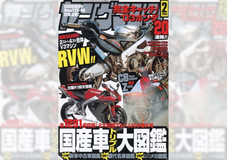 2ストローク+4ストロークを融合したV型3気筒の存在は、2003年1月号で初披露。リヤ1気筒の2スト側はクランク1回転毎に燃焼するので、実質的に4ストV型4気筒と同じ効果を発揮するとされ、高効率&コンパクトな超ハイメカを採用すると見られた。しかも、ホンダは「すでにエンジンを完成させた」とある!
