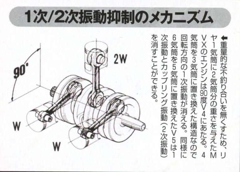 重量的な不釣り合いを無くすため、リヤ1気筒に2気筒分の重さを与えたMVXのエンジンは90度V4にあたる。4気筒を3気筒に置き換えた構造なので回転方向の1次振動が消える。同様に6気筒を5気筒に置き換えたV5は1次振動とカップリング振動(2次振動)を消すことができる。