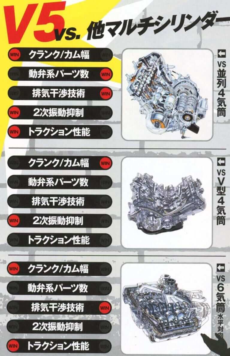 発想は単純にMVXの3気筒です。これは真ん中の1気筒に2気筒分の重さがあって1次振動を打ち消すという設計です。結果的には上手くいかなかったエンジンですが、それをコンピュータを使って研究して、4サイクルに適応したらV5になったというところではないでしょうか。