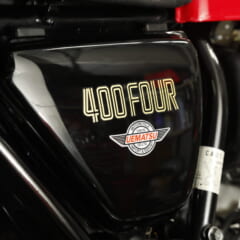 【ホンダCB400FOUR】主要諸元(1974年式)■全長2050 全幅705 全高1040 軸距1355(各mm) 車重185kg(装備) ■空冷4スト並列4気筒SOHC2バルブ 408cc 37ps/8500rpm 3.2kg-m/7500rpm 変速機形式6段リターン 燃料タンク容量14ℓ ■ブレーキF=ディスク R=ドラム ■タイヤF=3.00-S18 R=3.50-S18 発売当時価格32万7000円