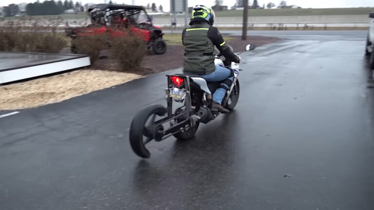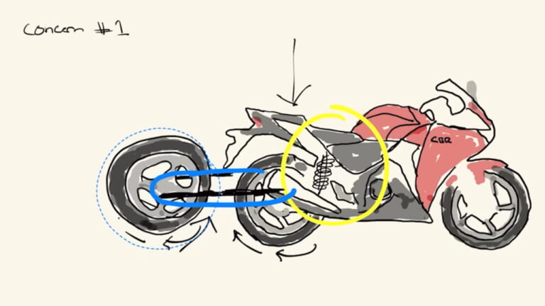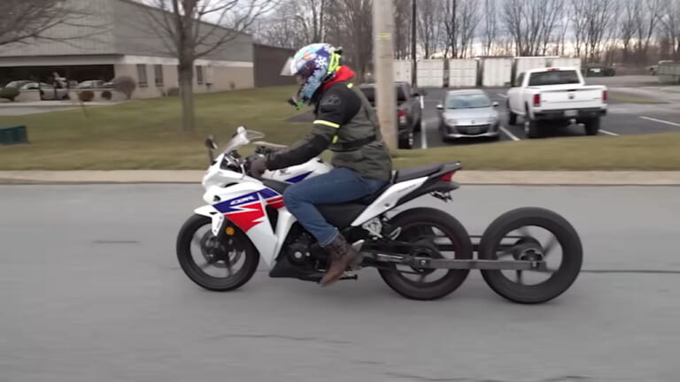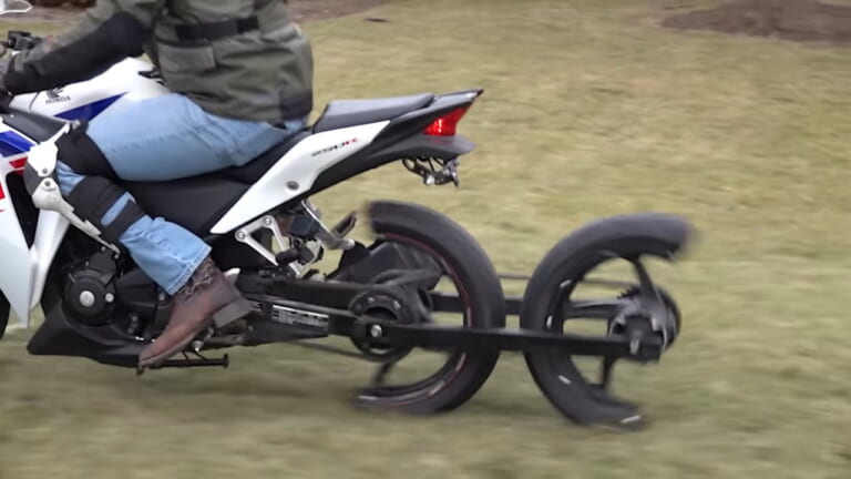 やっぱり走らせてみなくちゃわからないよね! とBikes and Beardsは変則3輪にしたCBR300Rを走らせますが、なにやらフィーリングが奇妙なご様子。というのも、後輪(前)と後輪(後)が、サスペンションがストロークするたびに交互に接地するような感じになるみたいです。