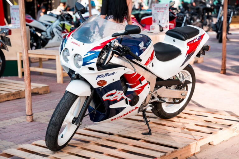 CBR250RRは1988年式を名乗るが、カラーリングは1992年頃のものと思われる。その年代でフロントブレーキがシングルディスクなところを見ると、海外向けの仕様なのだろう。