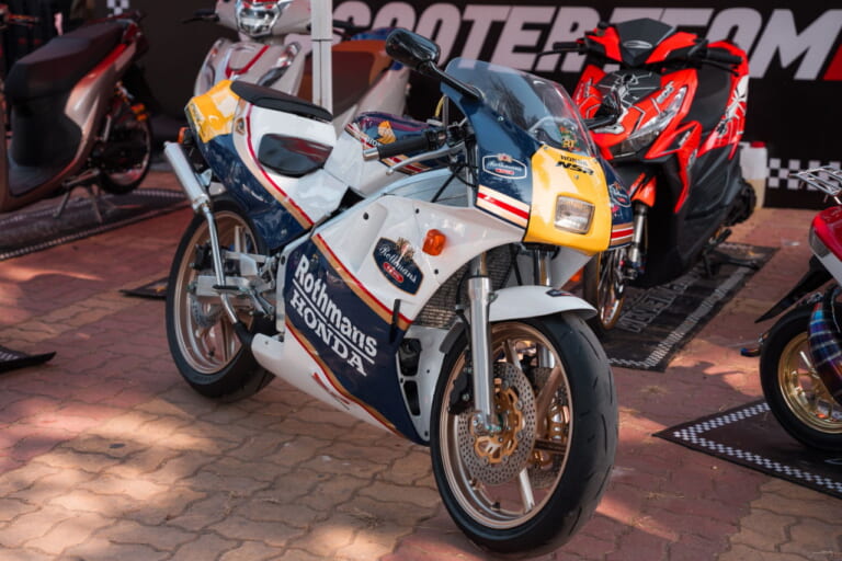 アイコニックバイクとして展示された3車。テントの反対側にはNSR250Rと思われるマシンの後姿もあり、ほかにも2車があるように見える。