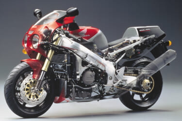TT-F1からスーパーバイクへのレースレギュレーション変更に伴い、RC30に代わるレースベース用ホモロゲモデルとして登場。90度V4 エンジンはサイドカムチェーン化やホンダ市販車初のPGM-FIで全面進化し、車体面も剛性が見直された新フレームで戦闘力をアップ。ワークスマシンもこれをベースに作られ、全日本や鈴鹿8耐などで快勝を続けた。