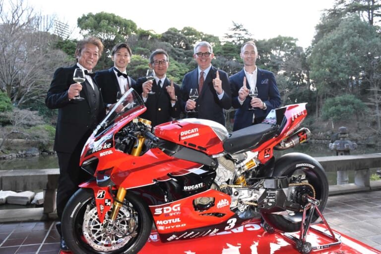 時間は大きく飛んで2024年2月15日。イタリア大使館でDUCATI Team KAGAYAMAの参戦体制発表が行われた。駐日イタリア大使がモータースポーツ(およびドゥカティ)好きだったことなど追い風もあったというが、なにしろモータースポーツのチーム発表をこうした公的機関で開催することは、日本の文化ではまずありえない。