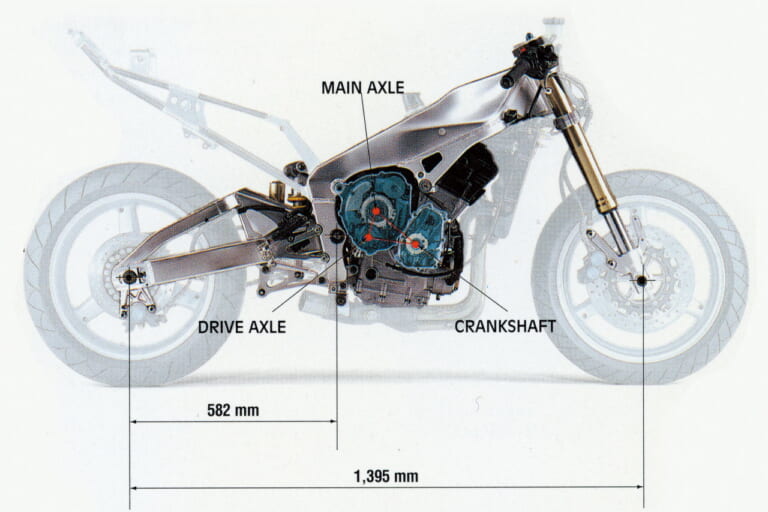 エンジンの主要3軸を三角形に配置するレーサー譲りの手法が超コンパクトな車体に貢献。よく動く足まわりと組み合わせて抜群の旋回性能を実現した。