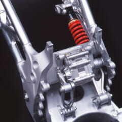 モノコックフレーム内部にはエアクリーナーやバッテリーを内蔵。燃料タンクは容量の半分がシート下へ潜り、重量配分の適正化に貢献。