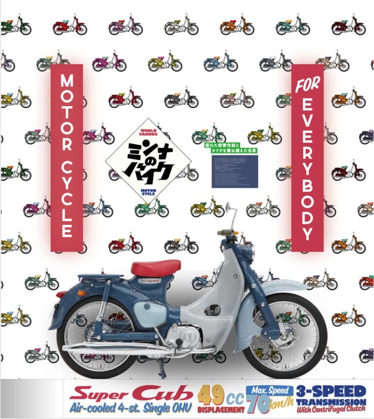展示車両は、モビリティリゾートもてぎ(栃木県)にあるホンダコレクションホールで動態保存されている貴重な車両。CB750FOUR、CBX400Fインテグラ、SUPER CUB、DAX、ROADPALの初号機などが渋谷へと運び込まれた。このほか、昭和のバイク雑誌のデザインをオマージュしたウォールグラフィックと、各車の販促用ポスターなどと共に店内に展示。さらに、先進性・独創性にあふれた技術で世界へ打って出たホンダの歴史を年表形式で紹介するコンテンツも用意される。