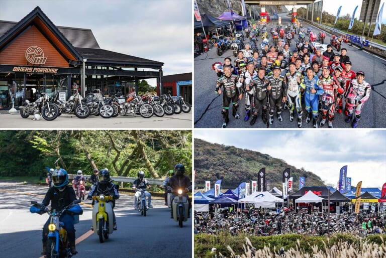 一昨年、昨年のモトライダーズフェスタの会場になったバイカーズパラダイスの駐車場には、国産・外車の新車や旧車が勢ぞろいした(写真左上)。ターンパイクの箱根伊豆連絡線の入り口にズラリと並んだレーシングライダーとレーシングマシン。来場者たちにはモータースポーツの雰囲気が強く感じられたはずだ(写真右上)。一昨年は、普段はターンパイクを走れない125cc以下の車両も走行した(写真左下)。駐車場はバイクであふれかえり、今年は会場の変更を検討中(写真右下)。