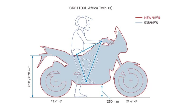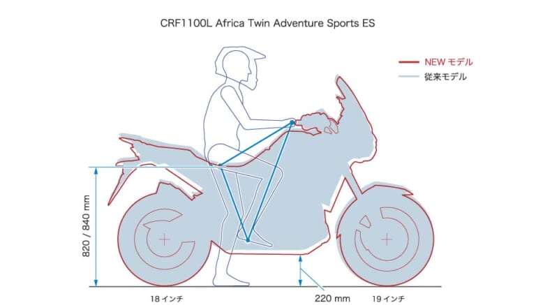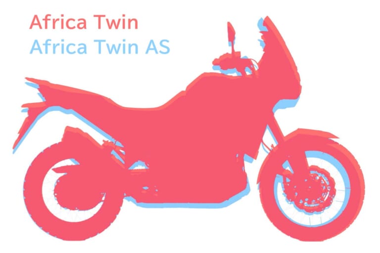 アフリカツインとアドベンチャースポーツ(AS)の2車をシルエットで比較。ホイールサイズやサスペンションストロークの違いによる車高の差などがわかる。