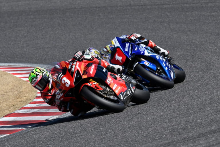 トップを快走した水野+DUCATI Panigale V4Rファクトリー。王者・中須賀がピタリとマークする。