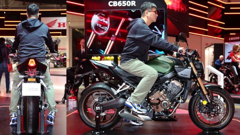 【EICMAで撮ったライディングポジション・身長170cm/体重71kg】CBはネイキッドとしては低めのバーハンドルを採用し、上体がやや前傾。ストリートファイター的なライポジだ。セパレートハンドルのCBRはさらに低いが、前傾は思ったよりも浅く、ツーリングも問題なさそう。ともにステップ位置はやや後ろ寄り。足着きは両足の腹がしっかり着く(欧州仕様)。