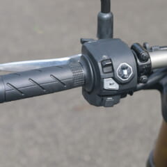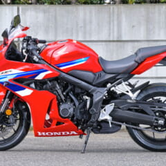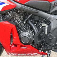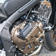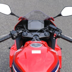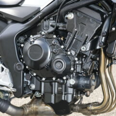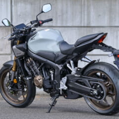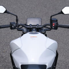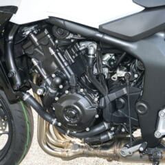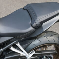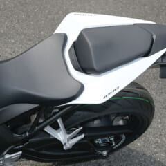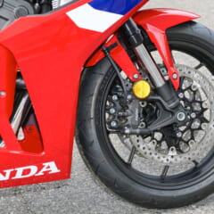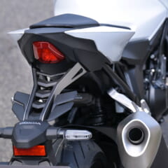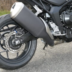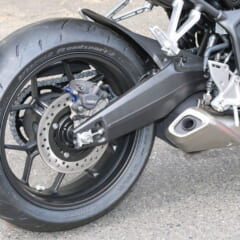 リヤは鋳造スイングアーム、フロントは倒立フォークとラジアルマウントキャリパーという組み合わせ。マフラーは腹下に収まるショートタイプだ。