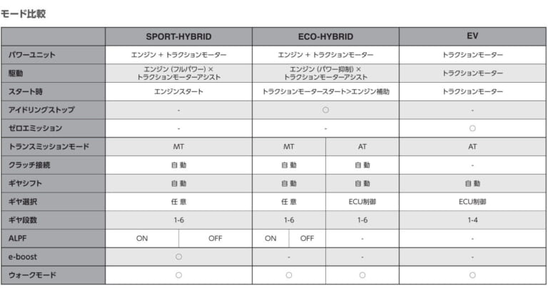 各モードの比較表。スポーツハイブリッドモードではMT操作のみでエンジンをフル活用かつeブーストが有効としているのに対し、エコハイブリッドモードはMT/ATが選べ、バランスよく使用しながらエネルギーを無駄遣いしないよう抑制している。MT設定の場合でもALPFのON/OFFは任意で選ぶようだ。ウォークモードはいずれの走行モードでも選択可。