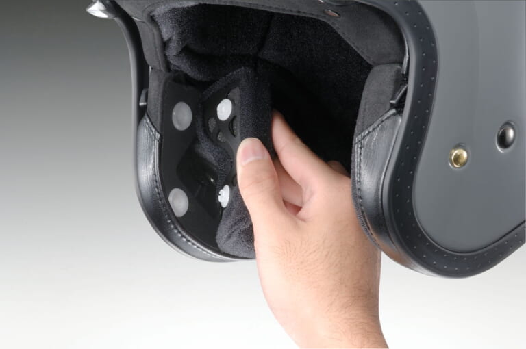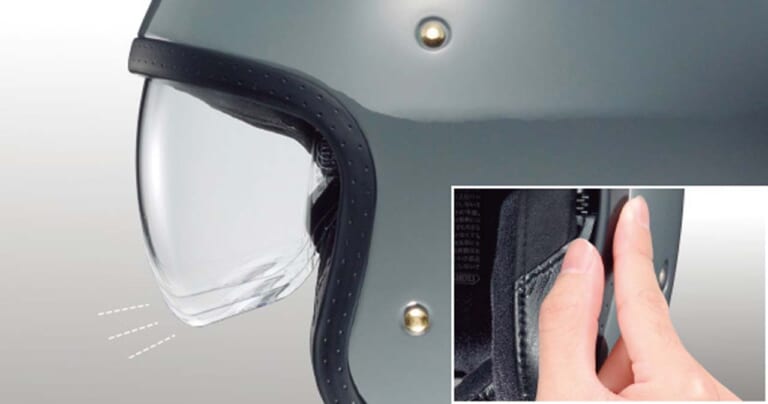このたび追加される『J・O+』は、バイザーを装着するためのドットボタンを前頭部に3カ所追加して拡張性を持たせたことが大きなトピックだ。これは同シリーズのオフロードフルフェイス『EX-ZERO』が備えている機能で、オプションアクセサリーとして用意されている『V-480バイザー』(4400円)を装着することができるようになった。