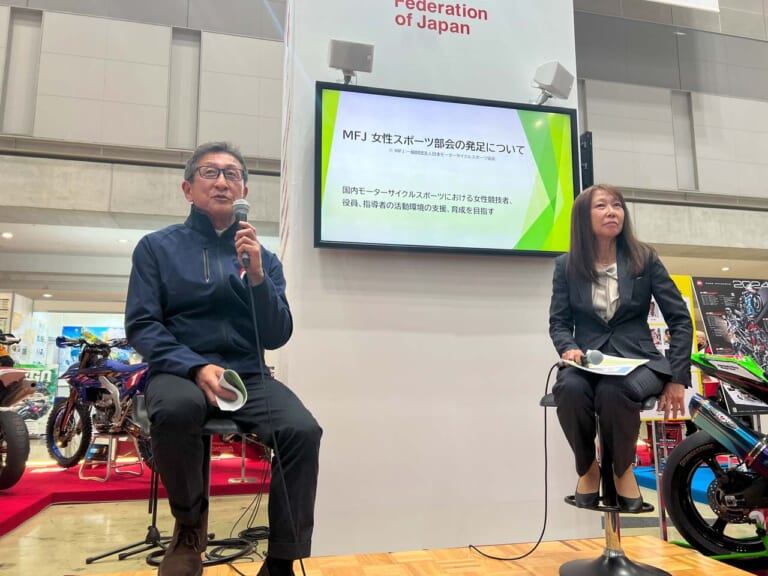 3月24日、東京モーターサイクルショーのMFJブースでカワサキモータースジャパン社長の桐野英子氏とMFJ会長の鈴木哲夫氏によるトークショーが行われ、MFJ 女性スポーツ部会発足が発表された。