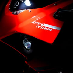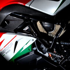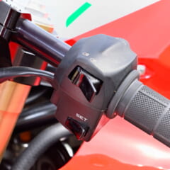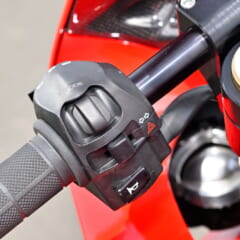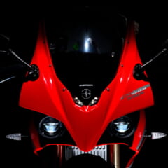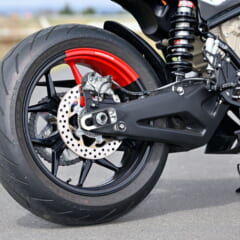 テールランプも細身のウインカーもLED。ナンバープレートホルダーへと伸びるステーには電気を表現するイナズマ状の切込みが入っている。