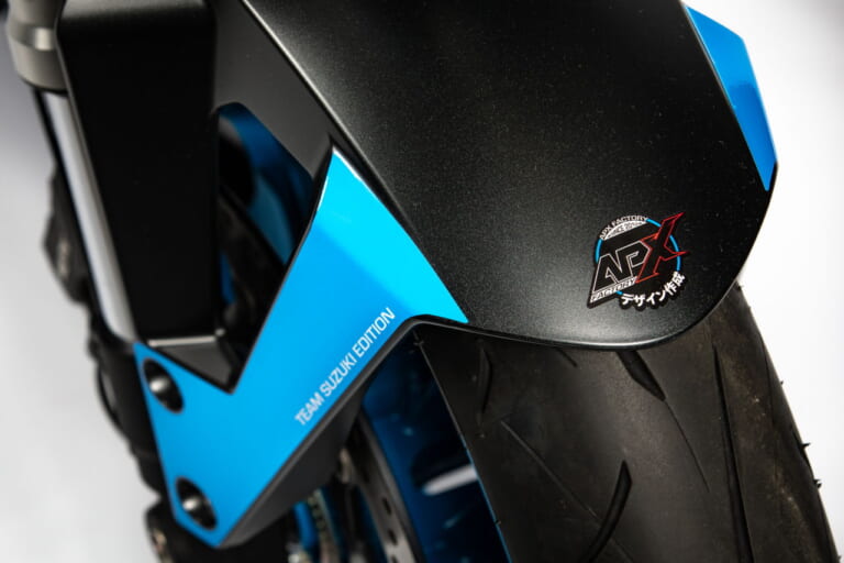 車体色ブルー/ブラックの両方にフィットするデカールキットは、燃料タンクにグレーで配置されたSUZUKIのロゴマークが特徴的で、シュラウドやホイールリムにも彩りを添える。このほか追加できるパーツはシングルシートカウル、アンダーカウル、ショートライセンスプレートホルダー、USB充電ソケットだ。