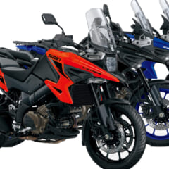 【SUZUKI V-STROM1050】■全長2265 全高1470 シート高850(各mm) 車重242kg ■水冷4ストV型2気筒DOHC4バルブ 1036cc 106ps/8500rpm 10.1kg-m/6000rpm 変速機6段リターン 燃料タンク容量20L ■ブレーキF=ダブルディスク R=ディスク ■タイヤF=110/80R19 R=150/70R17 ●色:青/黒 橙/マット黒 黒/マット黒 ●価格:162万8000円
