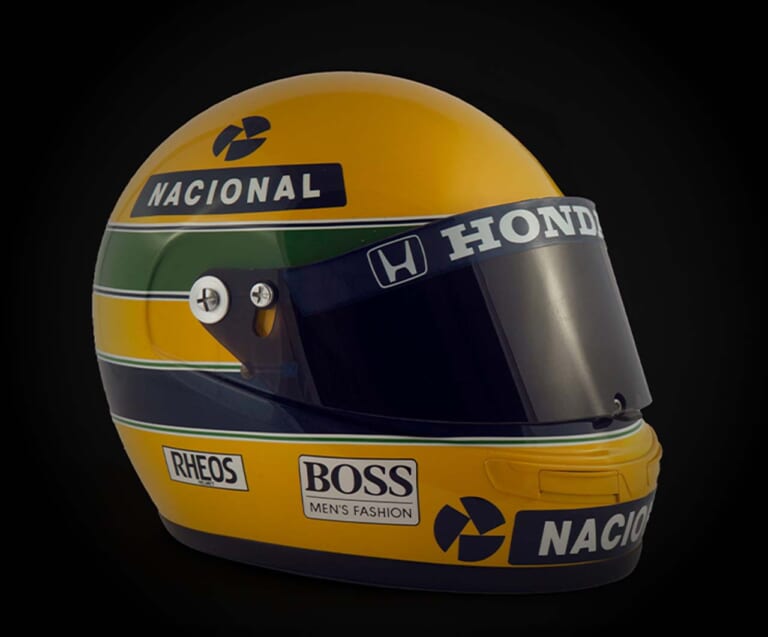 アイルトン・セナのヘルメット。1994年サンマリノGP、タンブレロコーナーでコンクリートウォールに衝突する事故で亡くなるまで、常に故郷ブラジルの国旗をモチーフとしたカラーリングを使用した。